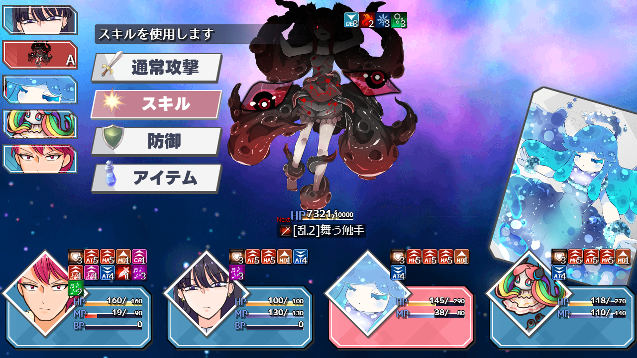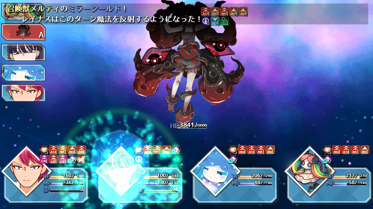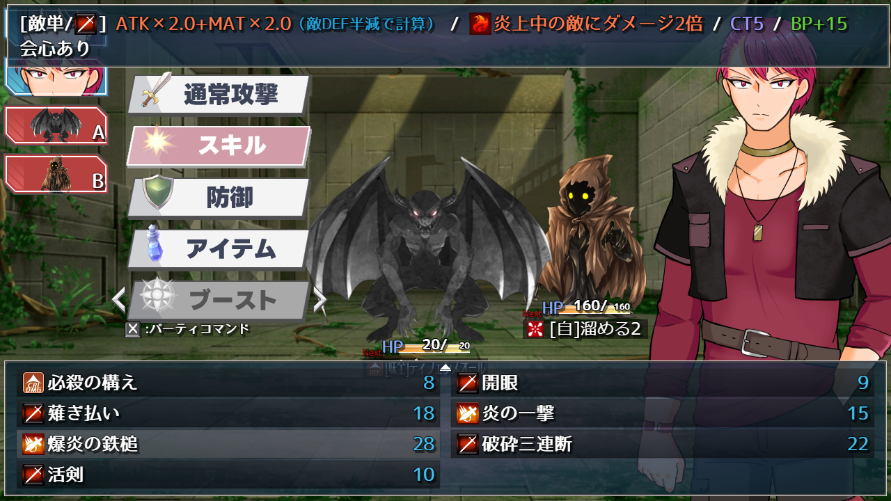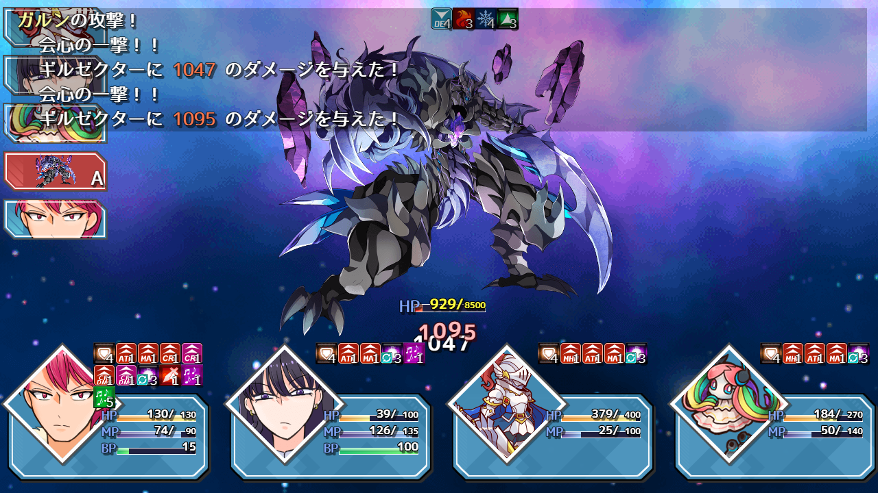 主に魔法で攻撃するレイナスが使う凍結では被魔法ダメージを上げつつ、一般的に「凍結」という状態異常が持つイメージである行動阻害の要素は回避率を下げるという形で実装。回避率低下が刺さる敵もいたり、ガルンのブースト通常といった外したくない大技の安定性を上げるなど戦闘デザイン上もいい感じに渋い活躍をしてくれました。回避率低下みたいな「あると嬉しいけど、それだけのために1ターン使うかというと……」くらいの効果が、ダメージ技についてるってのがまた丁度いいんですよね。それ目当てで使うまでは行かなくても、行動選択の際の検討要素には入るくらいの感じ。