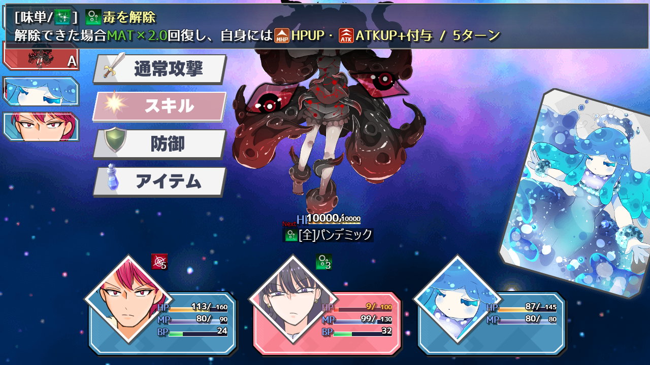 あとちょっとやってみたかったムーブとして、主にレイナスが毒を喰らったときにポイズンジェリーの「毒素吸収」で回復+ポイズンジェリーにバフ。敵の攻撃を逆手に取れるの、ちょっとテクい気分になれていいですね。アビスフィリアは攻撃自体はハードですが、ATKDOWN+に爆弾召喚、パンデミック(毒を喰らってなければどうということないし、喰らっていても後出し回復が可能)と、戦闘不能になる攻撃をしてこないタイミングがそこそこあるので、その隙を狙って後手回復でも立て直せるのは有り難かったです。この緩急もバランス調整が絶妙なところかな。