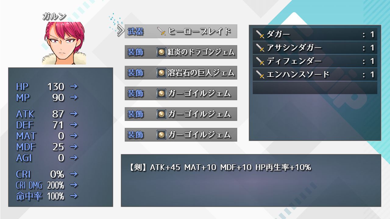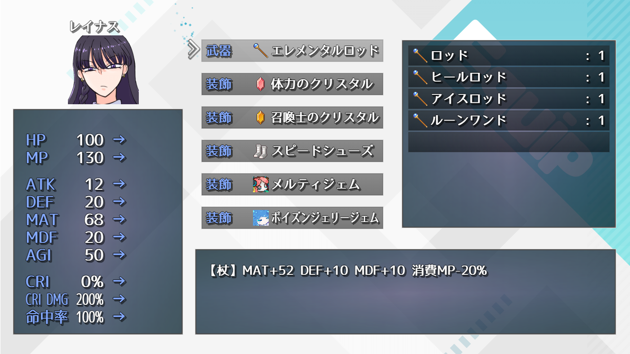 あと武器は基本的にドロップ最強の方が強いけど、店売り最強には最大HPを上げる効果があるのが悩ましいポイントでした。とくにレイナスは最大HP上げたほうがいいんじゃないかなぁ……と。でも結局DEFとMDFが上がる分である程度は相殺されそうな気もするし、ということでドロップ最強の方に。