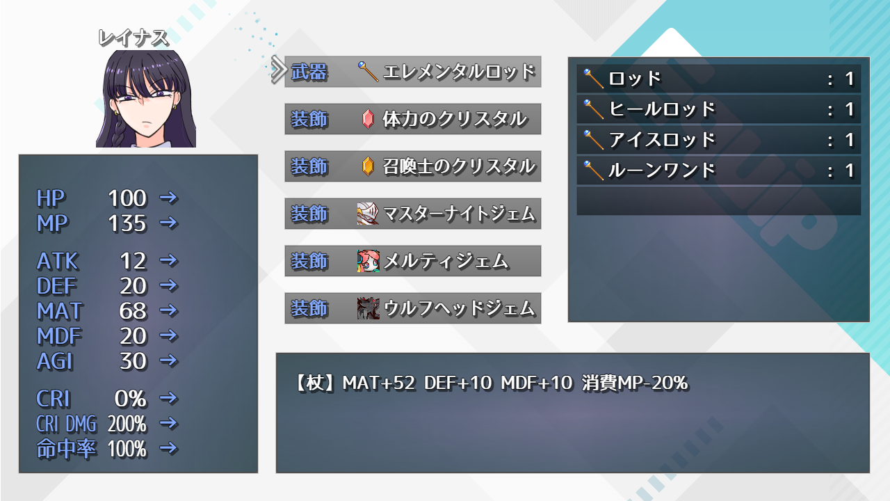5枠というのが多いようで実際には余裕があるほどではなく、いい感じに悩ましかったです。装飾品はざっくり分けると能力値を底上げするものと、いろんな特殊効果を発動できるものに分かれますが、特殊効果でなんか面白いことしようとすると、能力値上昇に枠を割けなかったり。とくにレベル1進行だと能力値にも余裕はないので、ここはジレンマでした。あとレイナスが召喚できる召喚獣の種類もジェムで追加する形なので、これも他の要素とのトレードオフだったり。